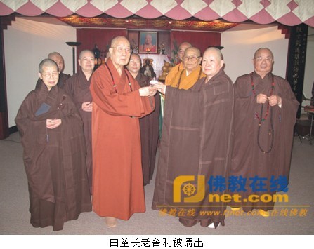 净良长老在致辞时,表示台湾中国佛教会将于5月3日率团护送白公长老舍利到江苏常熟兴福寺安奉,并路经上海静安寺暂奉,以慰白圣长老未完之遗愿,促进两岸和谐。随后,在净心长老指示下,白圣长老舍利被请出,并交由净良法师安排,以便届时迎请与护送。