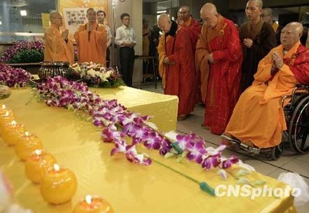 4月24日,香港佛教联合会为青海玉树地震受灾灾民举行“青海玉树大地震祈福息灾冥阳两利法会”,法会由香港佛教联合会会长觉光法师亲临主法,全港各佛教团体代表出席。图为觉光法师等向亡灵献香、献花致悼。(来源:中新社 摄影:张勤)