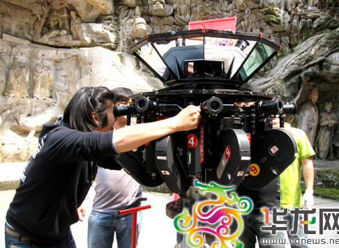 为实现环幕立体效果,该片由九台35mm摄影机立体摄影,能同步对周围360度景物拍摄。影片播放时,为达到视野最大化效果,也将使用九台放映机同步放映。在开机仪式上,记者见到了这个大家伙——九台摄影机围成一个圆,组成360度立体摄影机,能绕轴心进行旋转拍摄。