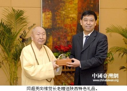 会见后,闫超英向惟觉长老赠送了代表陕西特色的礼品“华县皮影”,惟觉长老回赠了中台禅寺的“镇寺之宝”辟邪半圆水晶模型。(文:中国台湾网、陕西省台办联合报道)