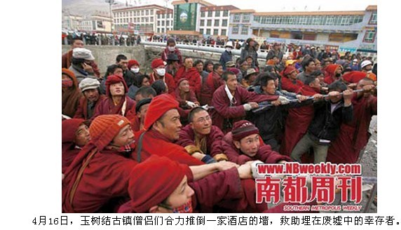 在大量外来救援部队到达之前,来自全国的4万多僧侣开始了最原始的手刨肩扛的救援。离街道最近的结古寺,第一时间做出了反应。震后一小时,丹巴仁波切组织了550名僧众,包括那些刚刚从土里被挖出来的轻伤员,作三队下山,分赴赛马场、体育场和西杭路。这三个地方,后来成了救灾的三大中心区域。
