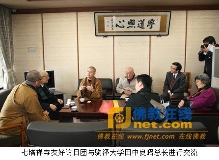 友好访日团一行于4月26日下午到达日本东京,受到村上博优先生与陈志成先生的热情迎接。27日上午,在陈志成先生、法音法师的陪同下,友好访日团一行参访了曹洞宗所办的禅宗名校驹泽大学。可祥法师与该大学总长(校长)田中良昭先生进行了交流,向该校赠送了《七塔寺志》、《七塔寺人物志》、《七塔禅寺五百罗汉图》、《七塔禅寺珍藏书画集》、《无言潮音》、《报恩》杂志,以及沈定庵先生书法作品,并参观了驹泽大学图书馆、日莲宗道场池上本门寺、净土宗道场增上寺等。