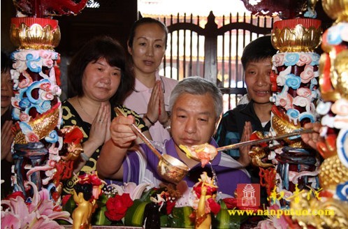 上午7时30分,南普陀寺两序仪仗队幢幡高树,法器声声悦耳,方丈则悟大和尚手托太子金像走进大雄宝殿,僧众庄严肃立,恭迎圣驾。唱诵过后,大和尚领众浴佛,僧俗大众依次在蓝毗尼园浴佛亭前跪拜问讯,手执金匙于香汤盆内盛水浴佛,口诵“我今灌沐诸如来,净智功德庄严聚,五浊众生令离垢,愿证如来净法身”的偈颂。法会一直持续到中午,信众游客蒙受法益,同享法喜。