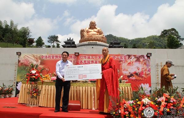 怡藏大和尚代表雪窦寺及爱心人士向市慈善总会递交助学善款