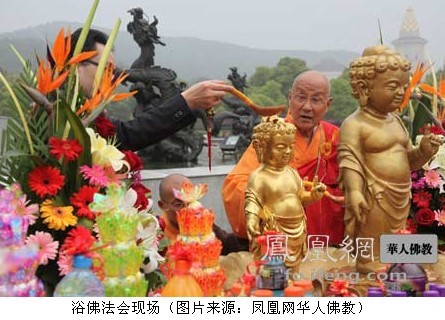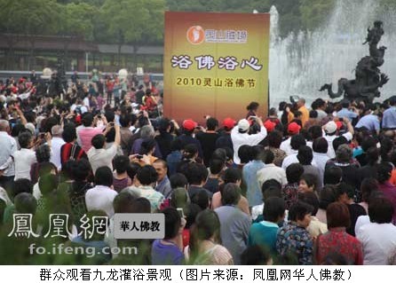 凤凰网华人佛教无锡讯 2010年5月21日,无锡灵山在灵山大佛脚下九龙灌浴广场举行盛大浴佛法会,庆祝释迦牟尼佛诞辰。法会由灵山祥符寺住持无相法师主持,来自社会各界的佛教信众及游客万余人聚集在九龙灌浴前,感受佛光普润,共沐佛陀恩德。