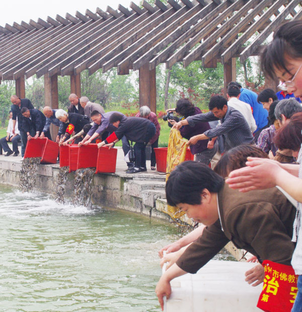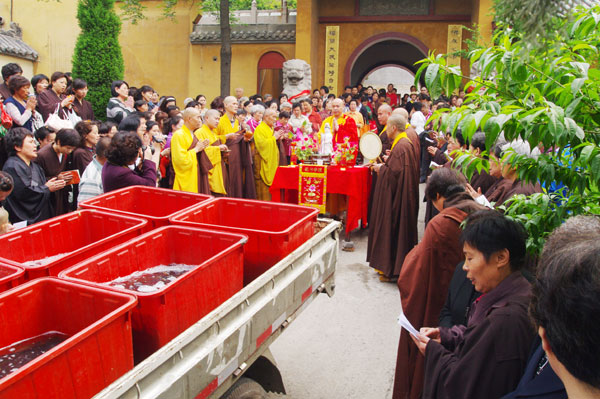 2010年5月21日是农历四月初八,为佛教浴佛节。这天五点多钟,兴化寺监院常信法师带领兴化寺功德会的工作人员及居士到菜市场购来3万多元的甲鱼、长鱼、黑鱼及泥鳅、螺蛳等。雇来七八辆车,满载着各种鱼种,排在兴化寺南门外。