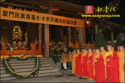 2009年8月23日晚6时30分,厦门南普陀寺、厦门红十字会、厦门市台商投资企业协会、海峡导报在南普陀寺大殿前举办了“台湾加油”烛光祈福法会。参加法会的僧众、义工1000多人。
