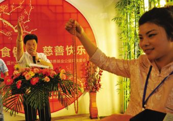 12:30宴会进行到一半,此次慈善素食宴的“重头戏”开始了,温州市汇丰拍卖行总经理杨秀清特意赶来主持六件拍品的公开拍卖。
