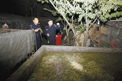 昨日凌晨2点,良乡该黑作坊,作坊主的大型农用三轮车停在水槽边上,已装上大量豆芽。水槽内满是浮起的豆芽和豆皮,旁边不远处也有两堆丢弃的豆芽。