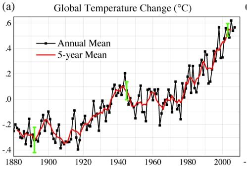 图名:全球气温变化(图中黑线为年平均温度,红线为5年平均温度)