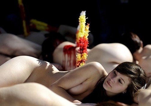 西班牙动物保护主义者裸体抗议斗牛运动