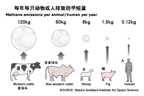 虽然西洋牛按每头牛计所产生的甲烷要比体型较小的非西洋牛多,但是它们的数量没有非西洋牛多,它们产生的甲烷只占牛排放量总和的约15%。肉类产量的“加倍”