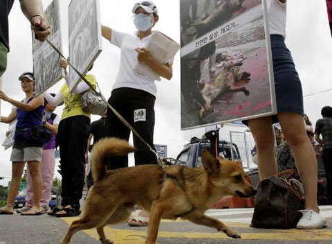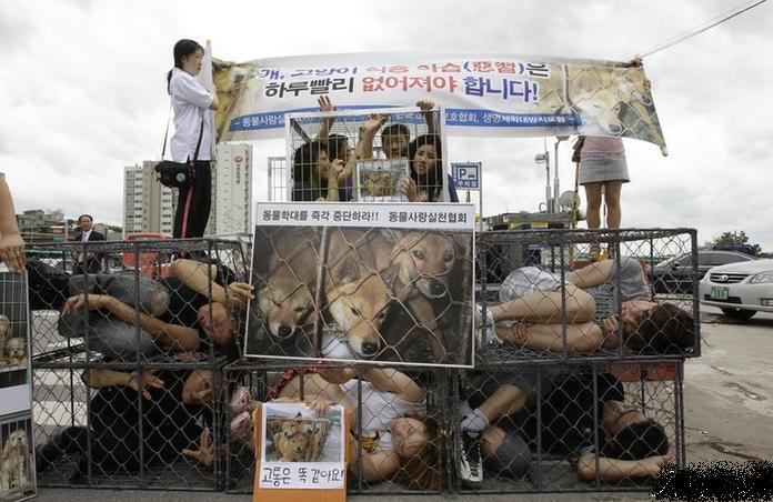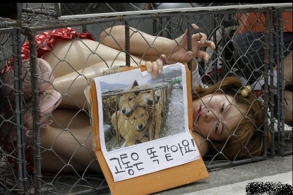 2010年7月18日,韩国动物权利保护人士成员把自己监禁在笼子内抗议韩国传统的吃狗肉风俗。牌子上的韩文意思为:同样的痛苦。