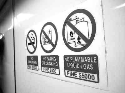 地铁是个相对密闭的空间,因此新加坡对地铁环境和安全方面的考虑更加细致。在地铁通道的墙上和车厢里都贴着一些明令禁止的行为:如果在地铁里吃东西、喝饮料,将面对高达500新币(1新币约合人民币5元)的罚款;吸烟会罚款1000新币;如果做了任何严重妨碍地铁正常行驶的事情,如携带打火机等易燃易爆物品,将被罚5000新币。此外,在地铁等公共场所随意乱扔垃圾也是绝对不能接受的行为,因为新加坡常年炎热,乱丢垃圾不仅会产生臭味,还会滋生病菌和蟑螂等昆虫,很容易引起传染病。大力度罚款最主要的目的就是对民众起到威慑作用,让大家都能紧绷遵守公共秩序,为他人着想这根弦。
