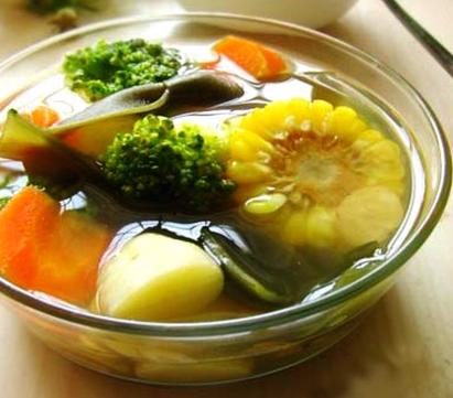 原料:胡萝卜1条、马铃薯1个、绿花椰菜1棵、甜玉米1穗、海带结3两、
