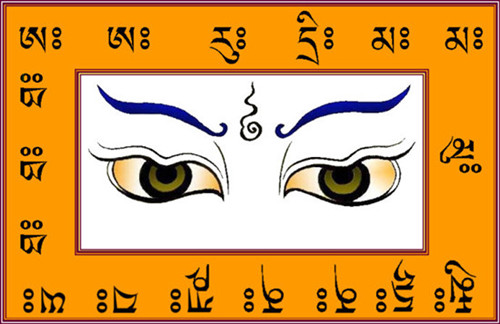 这个图,叫般若眼。属于修法的一个图。只要看过、忆想这个图,这个人就会获得清醒、警觉、欲求解脱、明达智慧的作用。因为这个图本来就是佛眼、佛眉毫光相的修法,一直到大圆满修法的表述。所以在印度、藏地的佛塔上,都有这个图。这个图,可以令人生生世世种下解脱的种子,或者即身成佛。