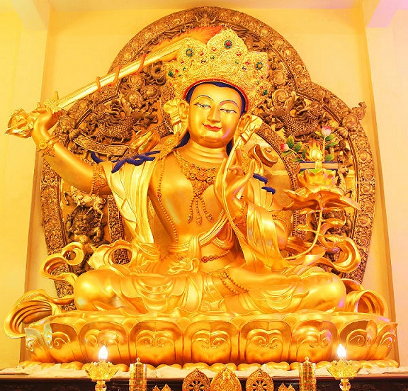 文殊菩萨,又称大智文殊师利菩萨,在佛教中是大智慧的象征。佛经中说,文殊菩萨于无量阿僧祇劫前早已成佛,文殊菩萨指导的弟子很多也已成佛,所以常被称为佛母、诸佛之师。
