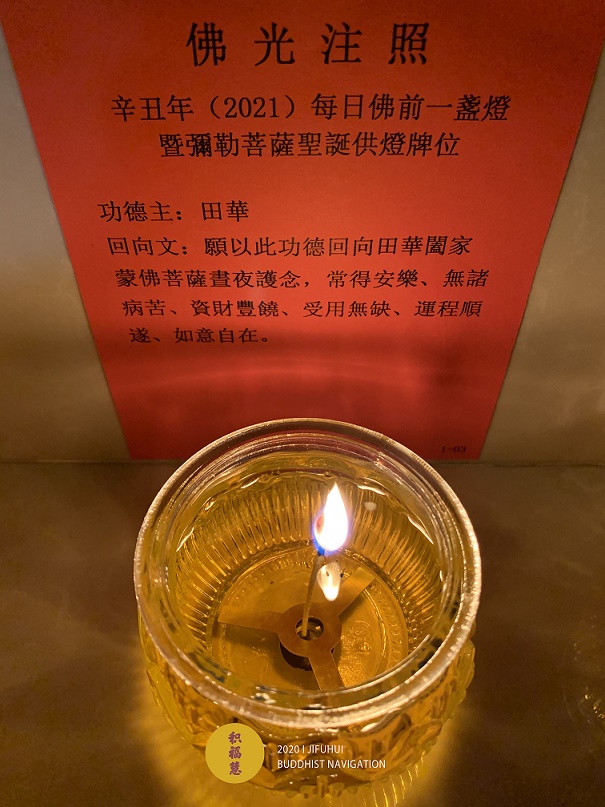积福慧以此辛丑年弥勒菩萨圣诞暨每日佛前一盏灯供灯功德悉皆回向给出资供灯者、点灯者、乃至一念随喜供灯者,祈愿大众在新的一年里,阖家安康,资财丰饶、工作顺利、运程顺遂、昼夜六时恒吉祥。愿疫疾止息,德海澄清,社会祥和,国泰民安。