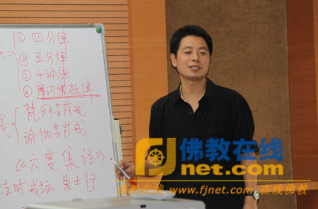 随后,王宏涛博士为大众深入的介绍了戒律有的分类标准。他说,佛教的戒律按照现有的佛教分布,从大类上可以分为大乘戒与小乘戒。大乘戒包括了梵网菩萨戒与瑜伽菩萨戒两类;小乘戒包括了法藏部的四分律、化地部的五分律、说一切有部的十诵律、大众部的摩诃僧祇律四部分。就其两者的特点来讲:大乘戒重在强调不损害他人的戒律;小乘戒则重在自我的解脱所要求的戒律。同时,从戒律的内容来划分,戒律还包括了止持戒和作持戒两类。止持戒是在于强调修行人进制作的戒律,如五戒、八戒、具足戒等。作持戒则侧重强调修行人应该要做的诸善行。王宏涛博士还着重强调了“犍度”一词,他说,“犍度”相当于“制度”,佛教的犍度包括了杂犍度、结使犍度、智犍度、行犍度、大犍度、根犍度、定犍度、见犍度等二十余种戒律类型。