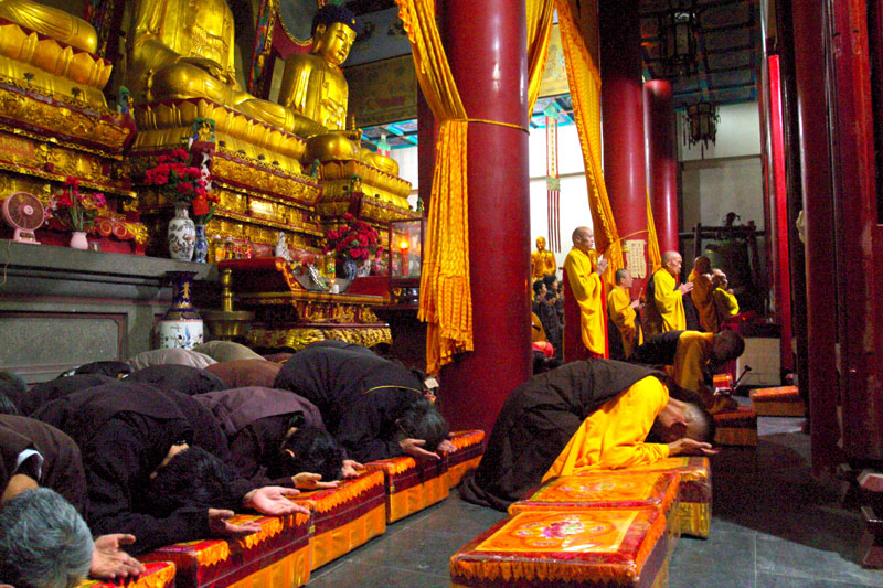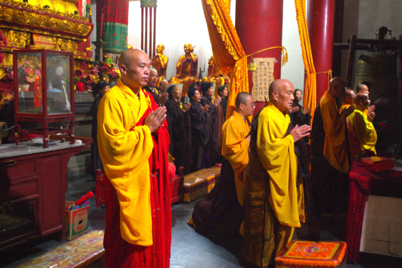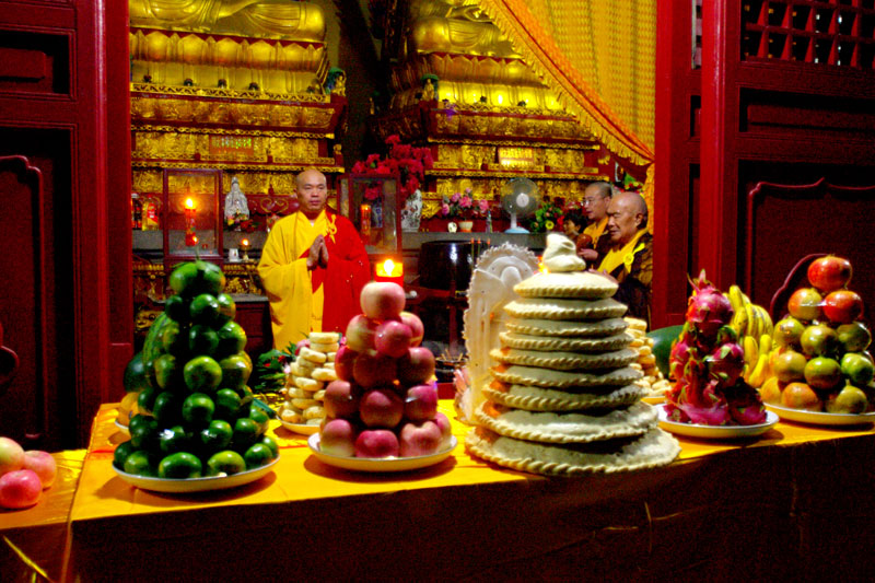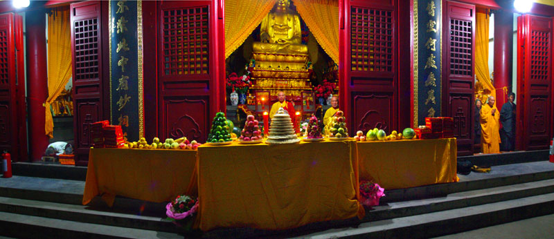 今年中秋节晚上七点半,兴化寺四众弟子在大雄宝殿,供上月饼、香蕉、苹果、石榴、橘子等各式食品和水果,兴化寺方丈果光大和尚带领四众弟子祭月礼佛,他并开示说,月亮代表我们的心,值此中秋佳节之际,为中华民族祈福,祈愿灾区人民重建家园,幸福安康;祈福伟大的祖国富强、繁荣昌盛,祈愿国泰民安,人民幸福,社会更加和谐。 (江苏徐州佛协 霍钦瑞 刘新 供稿)
