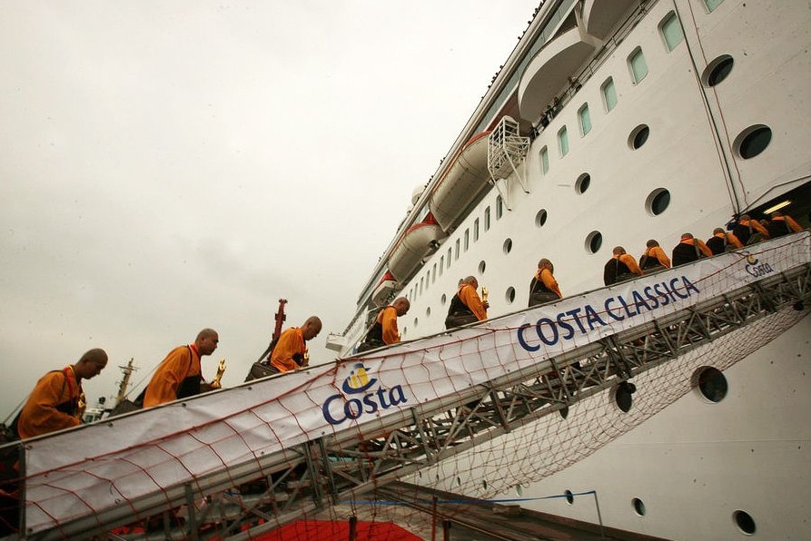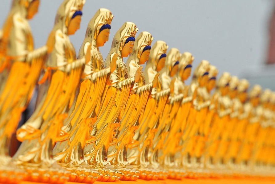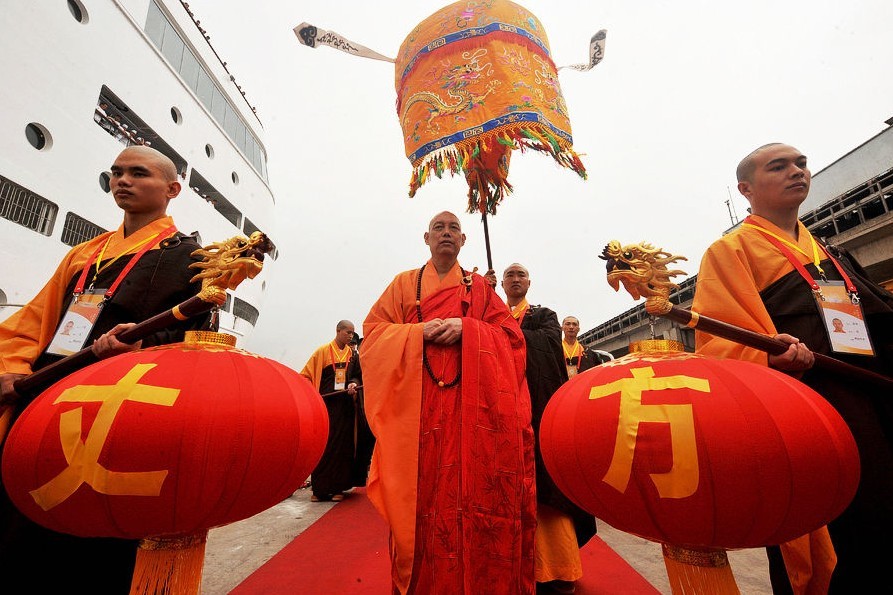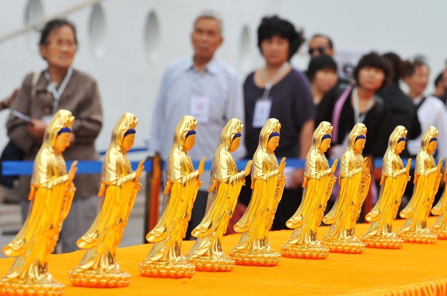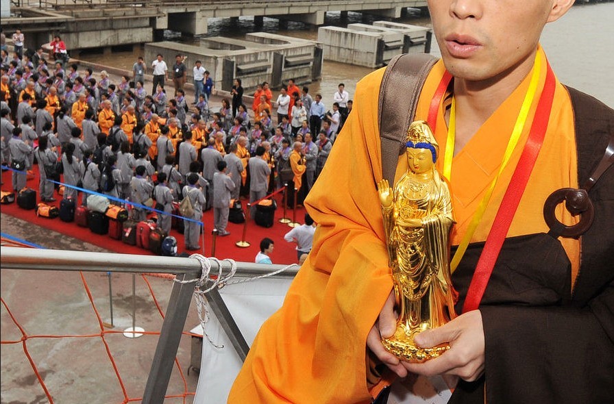 9月27日,浙江舟山,满载326位僧尼、居士,同时搭载1200位游客的“歌诗达·经典号”邮轮离港启航,开始舟山首次对台邮轮直航及大规模参访台湾之旅。1000尊南海观音像将被送往台湾千余寺庙供奉。