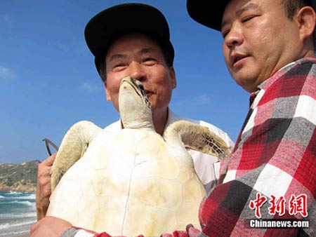海龟保护区工作人员称,今天放生的海龟,身上都无创标示了用于识别身份的电子条码,上面记录了放生者姓名及其所放海龟的电子条码,若干年后海龟重回海龟湾,就可以通知放生者前来相会。