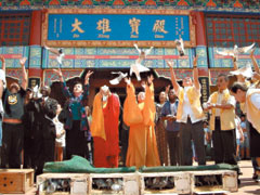 典礼结束,大众在大雄宝殿外放和平鸽,近百只和平鸽带着众人的祈愿与祝福飞向天空,为活动划下圆满句点。(文:周布朗 图:陆善愉)