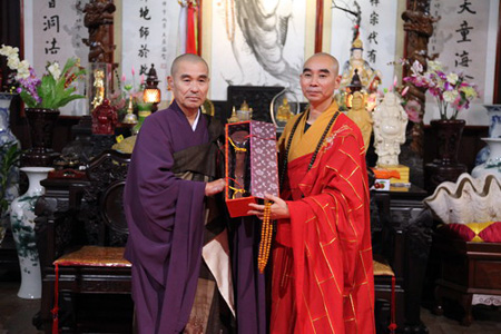 随后,黑田纯夫法师一行到云水堂参观了道元禅师得法灵迹碑,双方并到方丈殿座谈。诚信法师向黑田纯夫法师一行介绍了天童禅寺的历史及目前的发展状况,双方并互赠礼品。