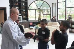 来到佛光山印度德里文教中心的早上,在宽敞的草场上可见到几位眼睛溜圆、鼻子高挺、一身黑黯皮肤的印度小男孩正在耍“功夫”,却是手脚轻柔,询问后才知道原来他们是在打著佛光禅,这批孩子们全部都来自释迦村,见到人都很有礼貌的合掌问好,他们就是德里文教中心主任慧显法师栽培的沙弥僧团,为复兴印度佛教所栽培的未来佛门龙象。