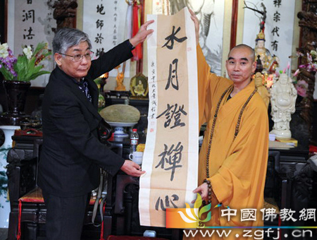 天童禅寺方丈诚信法师在方丈殿热情接待了小山寿一一行,并为他们讲述了天童禅寺的历史及目前的发展情况。小山寿一在讲话中说,“很感激天童禅寺的祖师把佛法传到了我们日本。”此外,诚信法师还向小山寿一一行赠送了字画及天童禅寺的简介,临行前双方并在大鉴堂门口合影留念。