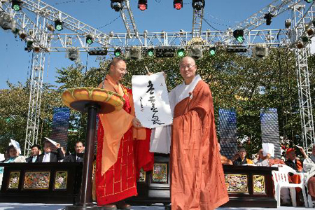 心定法师首先代表佛光山开山宗长星云大师致赠大师亲笔墨宝“应世无畏”予深山法师,祝贺深山法阿弥陀佛坐像开光大典吉祥圆满!同时他在致词中表示,10月10日,代表十全十美、良辰吉日、大众都能万事如意,弘法寺以后弘法都能十分顺利。