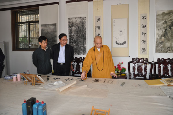 江苏省佛教协会副会长、徐州市佛教协会会长、兴化寺方丈果光大和尚在兴化寺江苏省源缘书画院热情接待了来客,并在白吕主任的提议下,当场泼墨分别为两位将军书写了 “止于至善”、“上善若水”的横幅。