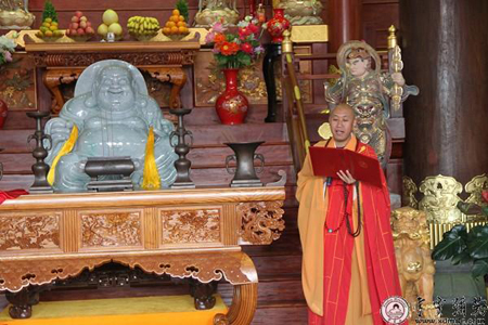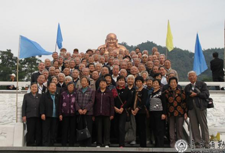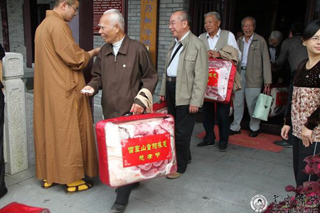 雪窦寺方丈怡藏法师在大殿内向全体老人致欢迎词。他说,重阳节是敬老节,孝是华夏文化根本,敬老是中国优良传统。中国佛教把孝分为三个层次:第一层次在物质层面的赡养父母,第二层次在精神层面的愉悦双亲,第三层次在宗教层面的终极关怀。今天是布袋弥勒圣诞日,布袋弥勒是慈孝的化身。最后他祝愿各位老人健康长寿,希望他们年年重阳都来雪窦山登高。随后,全体老人穿过大殿,登上龙华广场,在蓝天下,大佛前合影留念。