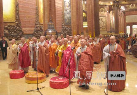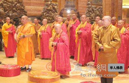凤凰网华人佛教无锡讯:2010年10月19日上午,第十三次中国、韩国、日本佛教友好交流会议在无锡灵山梵宫举行,三国佛教徒举行了祈祷世界和平法会。中国佛教协会会长传印长老,中国佛教协会副会长、中国藏语系高级佛学院院长嘉木样·洛桑久美·图丹却吉尼玛,中国佛教协会副会长刀述仁、学诚法师、永寿法师、永信法师、明生法师、祜巴龙庄勐、觉醒法师、湛如法师、心澄法师、增勤法师等高僧大德及出席会议的韩日两国佛教高僧正式代表参加了法会。三国佛教界人士在庄严的佛像前,分别按照本国佛教仪轨诵经礼佛。中国佛教代表团由中国佛教三大语系高僧传印长老、嘉木样·洛桑久美·图丹却吉尼玛、祜巴龙庄勐共同主法。中国佛教协会副会长明生法师、韩国佛教宗团协议会会长慈乘长老、日中韩国际佛教交流协议会理事长小林隆彰长老分别代表中韩日三国佛教代表团宣读了祈愿文疏。三国佛教界共同祈愿战争永息,灾难消除,福慧增长,吉祥安康。恳祈三宝加被,龙天护持,三国佛子,团结合作,黄金纽带,永放光辉。