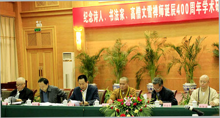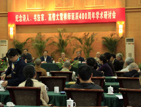 2010年10月25日上午,由四川省佛教协会、内江市佛教协会、内江圣水寺联合举办的“纪念诗人、书法家、高僧丈雪禅师诞辰400周年学术研讨会”在内江市隆重举行。中国佛教协会副会长、四川省佛教协会会长永寿法师,四川省佛教协会副会长智海法师、宗性法师,四川省佛教协会咨议委员会副主席演法法师等诸山长老;四川省宗教事务局副局长杨伯明,内江市委常委、宣传部长黄忠,内江市政协副主席陈玉春、周昌亮,市宗教局、市文联负责人等省内有关部门领导以及中国社科院杨曾文教授、黄夏年教授等来自全国各地高校、科研单位的专家学者等参加了研讨会。