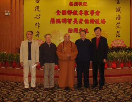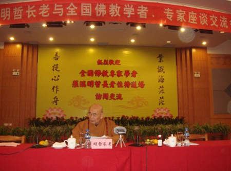 烟台 2010年10月25日,两岸佛教专家学者齐聚山东龙口南山禅寺与明哲长老同议佛教教育事业。