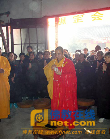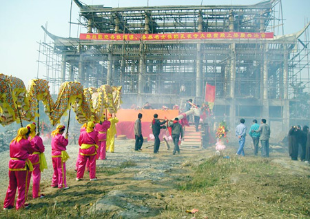 果隆法师法语道:“巍巍宝殿从地起,金梁遮日耸湖畔;十方大众成就力,诸佛法界显庄严。”随着法师三声响亮的“升”,顿时鞭炮齐鸣,锣鼓喧天。大殿主梁徐徐上升并安装到位。