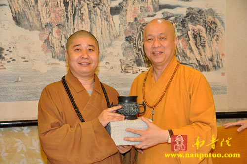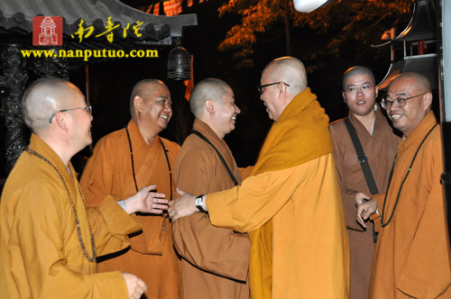 2010年11月25日傍晚6时许,新加坡佛教总会副主席、佛牙寺方丈法照大和尚,台湾中国佛教理事会副理事长心茂大和尚等一行十余人到访厦门南普陀寺。厦门佛教协会会长、南普陀寺方丈则悟大和尚,厦门佛教协会常务副会长定恒法师、副会长法云法师、副秘书长世澄法师等在天王殿前热情迎接。宾主双方同至大殿礼佛后,由厦门佛教协会和南普陀寺常住在普照楼共同宴请法照大和尚一行。