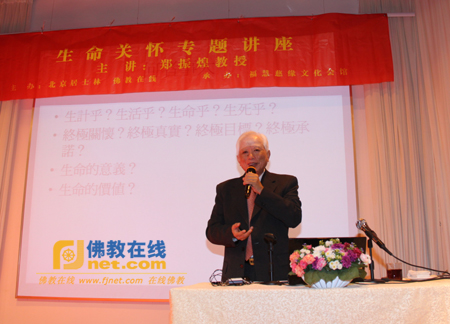 最后,郑教授讲到关怀生命不仅仅从教去了解,还有从修行做起,他为大家提出了当下应如何做起,第一改变知见:缘起性空,第二该改变思维:正面、光明、乐观;第三、改变语言:柔软语、爱语、鼓励语,第四改变行为:止恶行,戒定慧;第五、改变职业:适合个性、不害众生;第六改变态度:看破、放下、提起、承担,第七;集中心志,无事不办;第八、觉照分明:惺惺寂寂、息增怀诛。