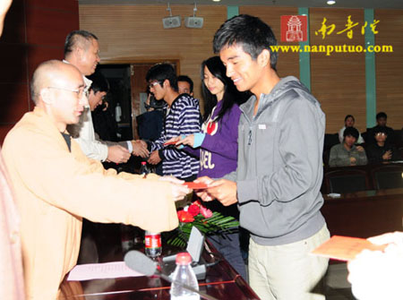 发放仪式上,正兴法师等为学生发放了助学金,并鼓励他们:好好学习,感恩父母师长,并将爱心不断地传递下去,将来回报祖国,服务社会。仪式结束后,开始座谈。同学们踊跃发言,各自谈了对慈善的理解、对社会的责任以及对南普陀寺慈善会与市慈善总会的感谢之情等。正兴法师与蔡宗葛秘书长对相应问题一一做了回答。现场十分活跃,充满了感动与温馨。