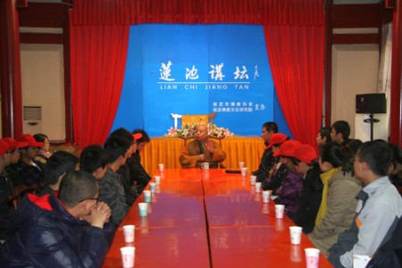 下午四点,真广法师与大学生志愿者进行了座谈。真广法师简单介绍了佛教的发展历史,叙述了佛教在文化、语言、雕刻、建筑等方面产生的深远影响,还慈悲的开示要广结善缘,劝诫凡事以尽心为主。
