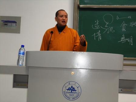 据悉,道坚法师运用文献学、历史学及考古学理论,将佛教在巴蜀地区的传入、发展以及文化冲突与融合等,作了深入探讨,认为佛教在巴蜀地区的民族融合和人文建设等方面,作出了大量的贡献。法师的演讲引经据典,深入浅出,语言幽默而富有哲理,给同学们带来了一堂生动的文化课。最后,山东大学的同学们纷纷提问,并进行了互动交流。