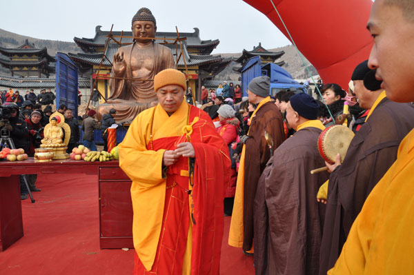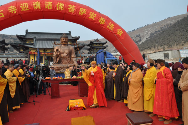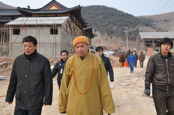 数百名四众弟子参加迎请佛像安奉法会。法会结束后,贾汪政协副主席、统战部长周常善,贾汪区副区长孙清理等领导与果光大和尚视察了一期主体工程已建成的各个殿堂。