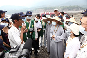 法鼓山灾区重建总体营造规划团30日上午首先前往六龟乡旧潭村勘灾,下午接着前往新发村新开部落勘查,并由法鼓山僧团都监法师果广法师带领团员及代表们为新开部落不幸罹难往生者颂念心经回向。勘查行程结束后,规划团团员与六龟乡代会主席潘星贝等地方代表进行意见交流,听取地方居民的建议与需求,以利未来思考纳入未来重建规划的考虑。