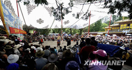 当日,2009年拉萨雪顿节在罗布林卡闭幕。“雪顿”原意为“酸奶宴”,成为拉萨地区的民间节日已有300多年历史,最初是僧侣经过夏季闭门静修,与老百姓共享初秋美景与丰收美食的欢乐聚会。后来,寺院难得一见的盛大展佛仪式成为节日的开端,藏戏等特色民间文化活动则成为节日的主角,雪顿节又有了展佛节、藏戏节等别称,其隆重程度仅次于藏历新年。新华社记者 普布扎西 摄