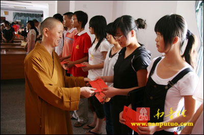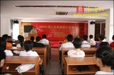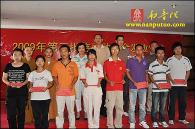 9月1日,受会长圣辉大和尚嘱托,德鸣法师、演传法师、静仁法师一行来到厦门市民政局四楼会议厅,参加了厦门市慈善总会组织的“2009年第三批慈善助学金发放仪式”,此次我会资助厦门市10名贫困大学生,每名3000元,共发放助学金3万元。 南普陀寺慈善会每年在新生开学期间都有组织助学活动,为贫困学子发放一定的助学金,帮助他们顺利完成学业。今年从8月份开始至今,我会已相继资助近30名贫困学生走进大学校园。愿有更多的爱心人士关注贫困大学生,奉献爱心,让他们接受更高等的教育,为社会培养更多的人才。