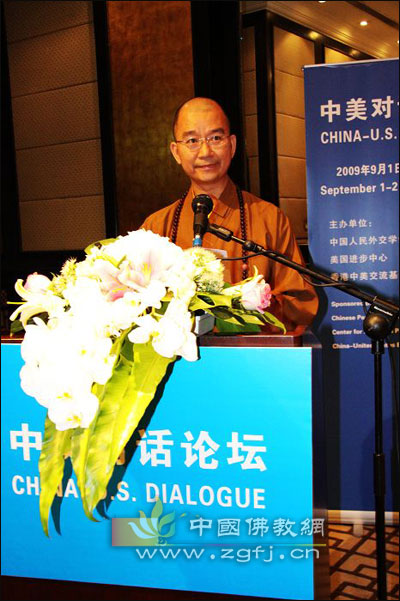 在热烈庆祝中华人民共和国成立六十华诞前夕的首都北京,我谨代表中国数以亿计的佛教徒,对以约翰·波德斯塔主席为代表的“美国进步中心”的各位尊贵的客人,表示最真诚的祝福。