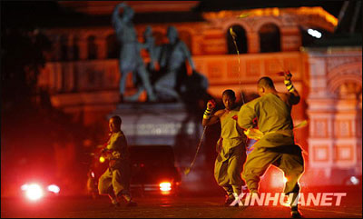 9月4日晚,在俄罗斯莫斯科市中心的红场上举行的俄罗斯国际军乐节开幕前夕的总彩排上,中国少林武僧在表演节目。当晚,来自俄罗斯、中国、意大利等国的约千名演员参加了俄罗斯国际军乐节开幕前夕的总彩排。其中,中国嵩山少林寺武僧们展示的棍法、鞭法等中国功夫令在场观众惊叹不已。
