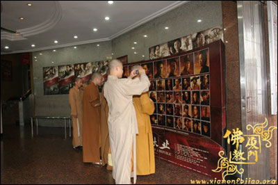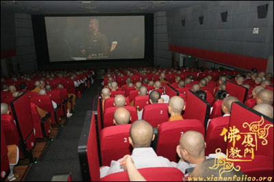 喜逢新中国建国60周年大庆,由厦门佛教协会组织,厦门佛教协会和南普陀寺共同出资支持,厦门佛教界四众弟子共同观看《建国大业》爱国电影。重温历史,体会建设新中国的艰辛历程。 昨日上午7点30分,闽南佛学院男众部、女众部全体师生在思明电影院一起观看了《建国大业》爱国电影。现场上,学僧们时而欢笑,时而紧张,深感建国艰辛,更珍惜今日来之不易的太平盛世。好好学习佛法,做好自己的本分事,爱国爱教,发扬佛教优良传统。