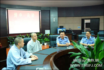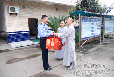 在国庆、中秋双节即将来临之际,受峨眉山佛教协会永寿会长委托,9月24日,峨眉山大佛禅院知客镇祥法师、昌林法师等代表大佛禅院全体僧众,向峨眉山市交警大队、绥山镇派出所、胜利镇派出所的公安干警及峨眉山市消防大队的武警官兵送上节日的问候,感谢他们长期以来对大佛禅院治安、消防等工作的关心、支持和帮助。